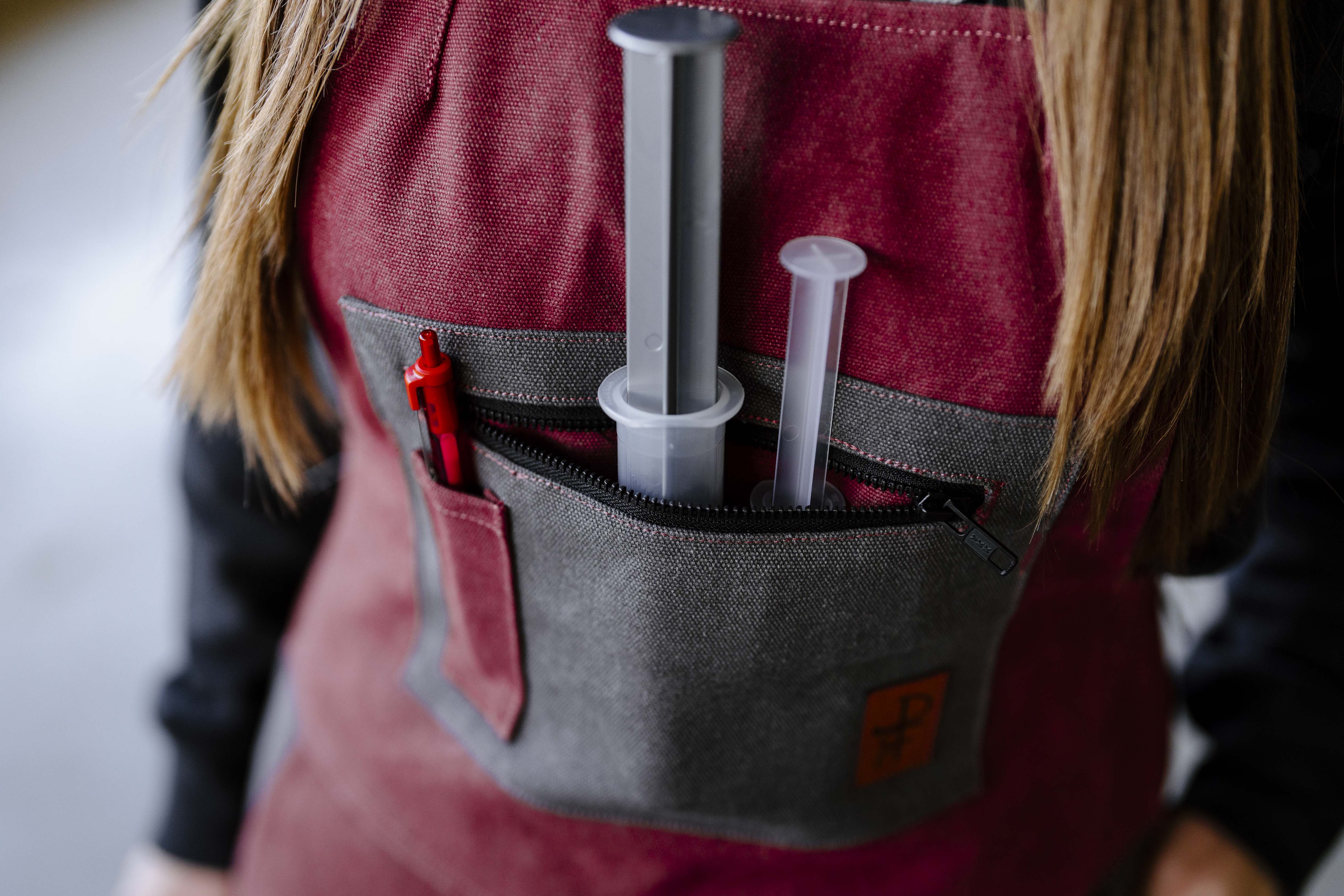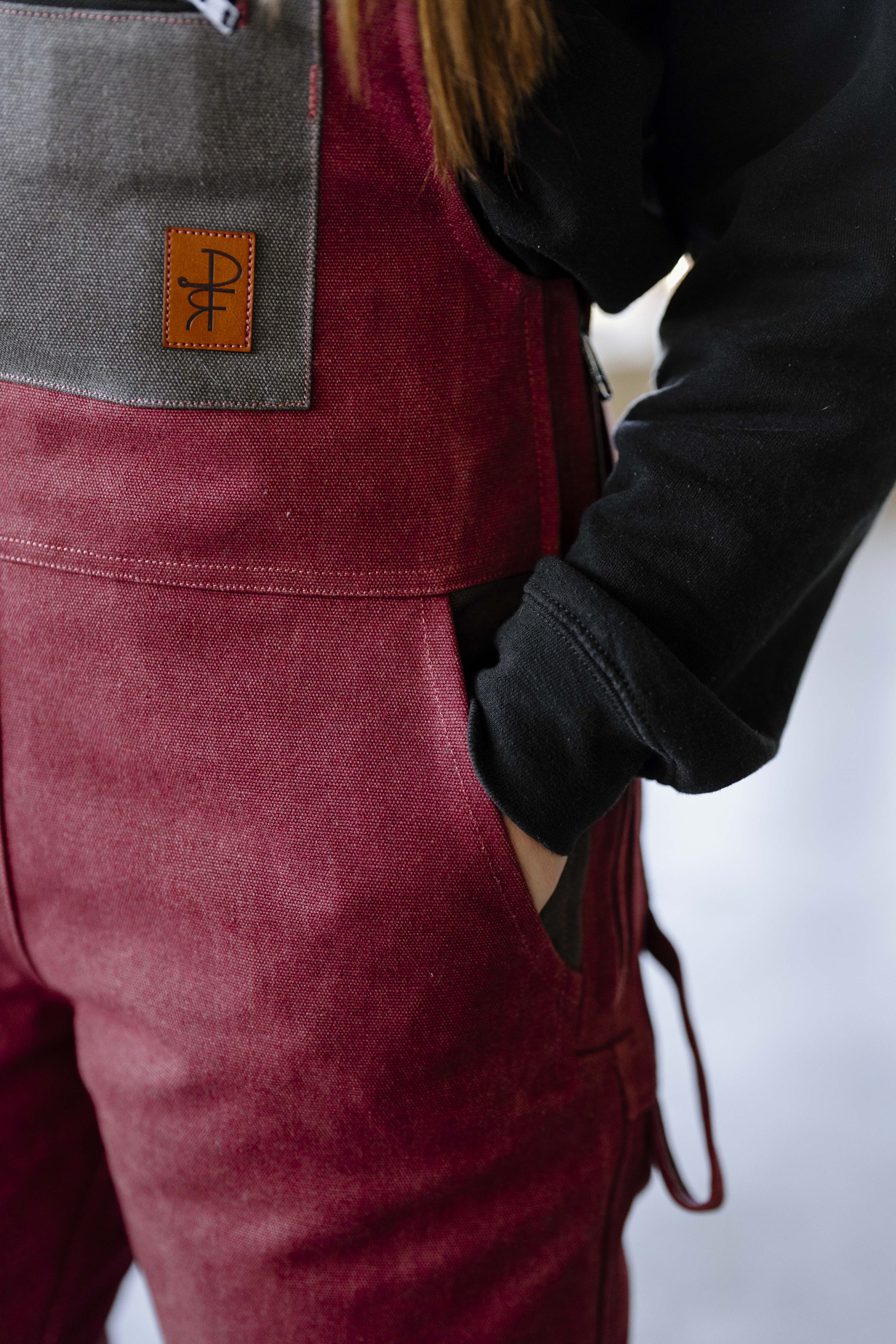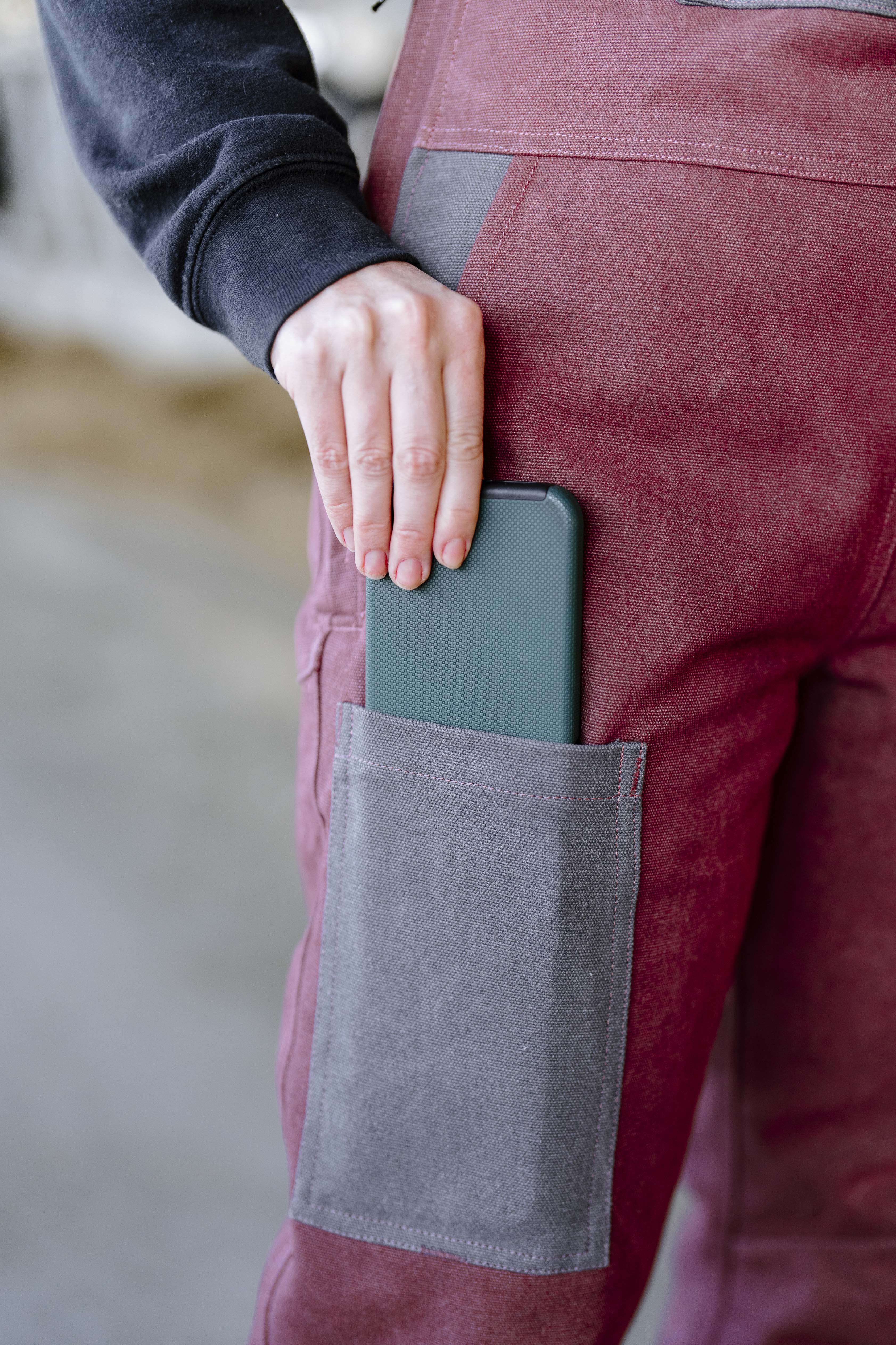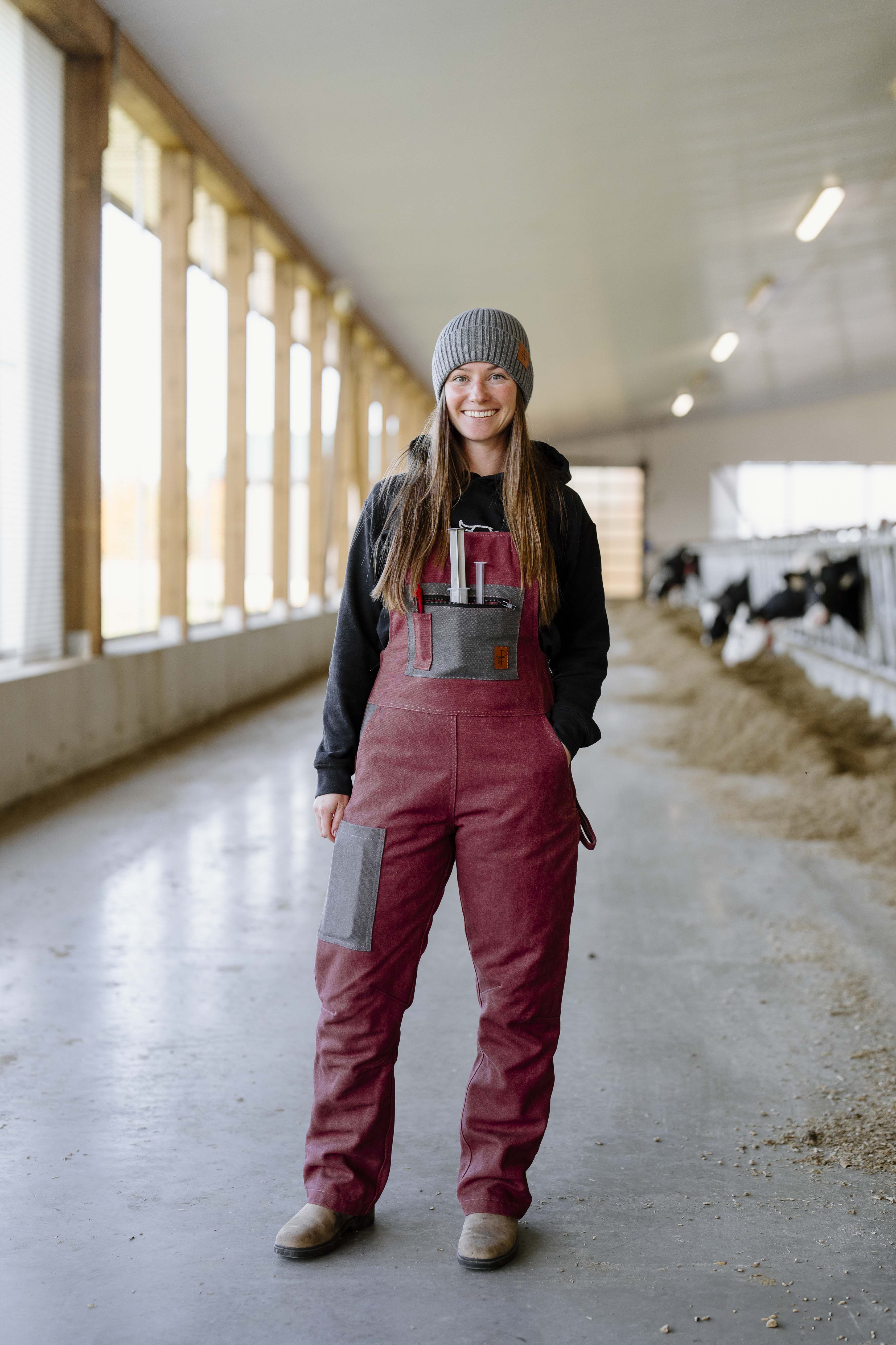 Rose and charcoal. Flattering, durable, cozy and warm. Fitted to highlight your waist and allow room for your hips, with seams in all the right places. Featuring a lightweight, quilted polyester lining to keep you warm without too much bulkiness. Features: thigh cell phone pocket, two bum pockets, zippered chest pocket with syringe holders, pen pocket, front pockets, and hammer loop. Heavy duty side zips for ease of putting on. Elastic straps for improved mobility and high grade buckles that won't come undone while working.