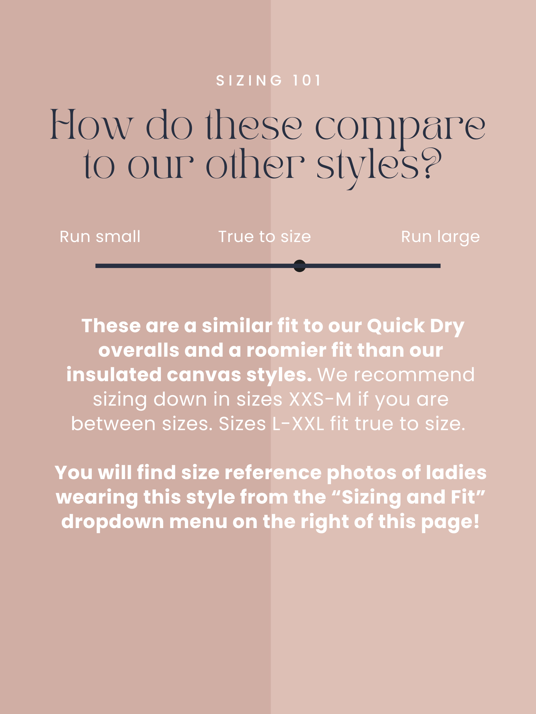 Blyth is shown wearing a size 1X insulated pair in the regular length. She typically wears size 18 most clothes. She wears a size XXL in our Quick Dry styles but sizes up in the canvas.